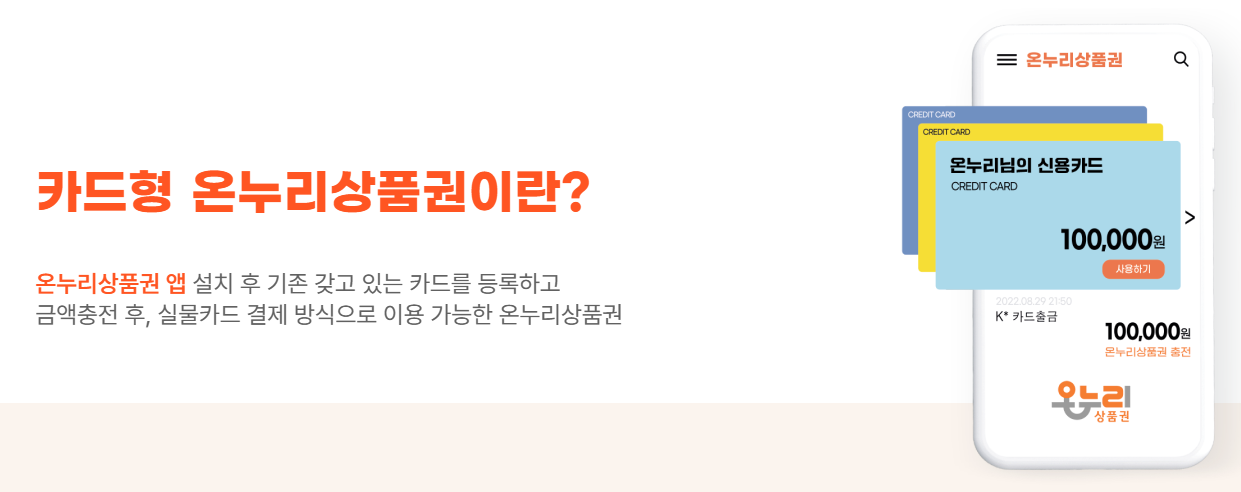 금액 충전 후, 실물 카드 결제 방식으로 이용 가능한 온누리 상품권입니다.